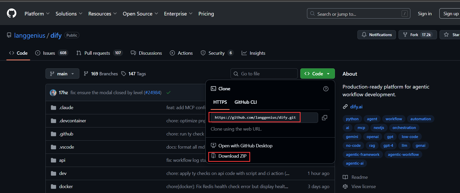 4.1下载dify文件,可以通过git或者直接下载zip压缩包