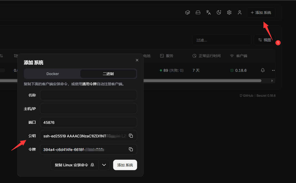 curl -sL https://raw.githubusercontent.com/henrygd/beszel/main/supplemental/scripts/install-agent.sh -o install-agent.sh && chmod +x install-agent.sh && ./install-agent.sh -p 45876 -k "你的SSH公钥"
